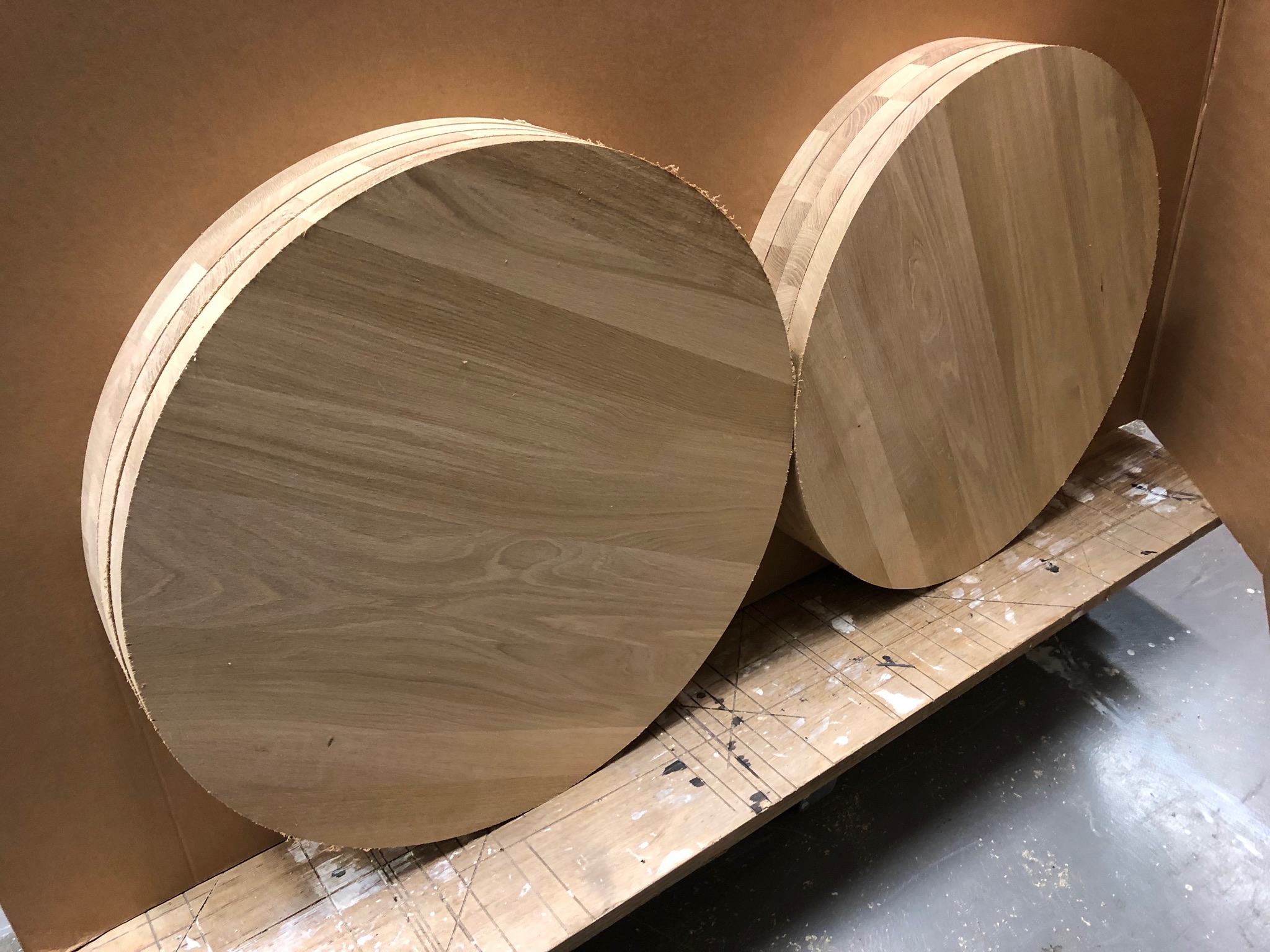 Voor een cafe interieur maakten wij enige tijd geleden deze serie ronde tafelbladen van dik eikenhout. De cnc frees is bij uitstek geschikt voor het maken van ronde tafelbladen van multiplex of massief hout. Deze serie is in een bijzonder cafe interieur terecht gekomen in samenwerking met een meubelmaker in Amsterdam die de bladen heeft afgewerkt en op locatie gemonteerd. Heeft u interesse in een massief houten rond tafelblad of een serie tafelbladen? Neem dan vrijblijvend contact op met De Firma CNC, Utrecht, wij helpen u graag!